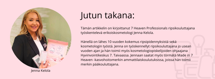 Olen toiminut ripsienpidennysten parissa jo melkein 10 vuotta. Ensimmäiset ripseni tein vuonna 2015, jolloin ripsitarvikkeet ja tekniikat olivat hyvin erilaisia verrattuna nykyiseen. Selkein muisto liittyy sen aikaisiin liimoihin: oli täysin normaalia haistaa liima alustalta monen metrin päähän ja silmiä kirveli ripsiä tehdessä. Myös asiakkaat kokivat kirvelyä ja punoitusta, jonka sanottiin helpottavan illan aikana. Hellävaraisista liimoista ei tuolloin ollut tietoakaan. Jos silloin joku olisi kertonut, että 10 vuoden päästä asennamme ripsiä valon avulla, olisi ajatus kuulostanut todella hassulta.