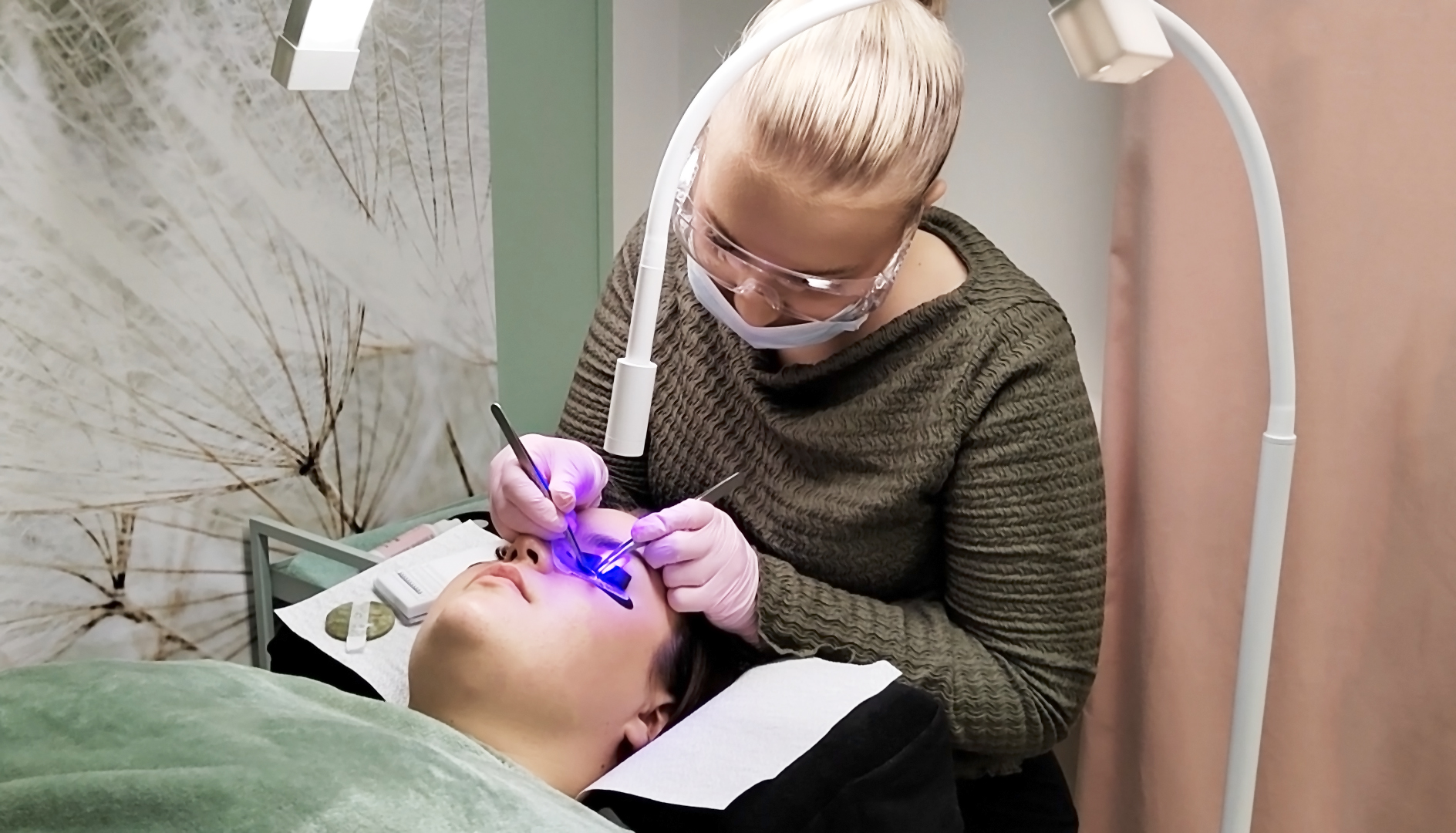 Kun perehdyimme tekniikkaan tarkemmin ja otimme yhteyttä esimerkiksi Säteilyturvakeskukseen, saimme kaipaamamme mielenrauhan ja rohkeuden kokeilla UV-valolla tehtäviä ripsiä. Työtahdin nopeus ja vaivattomuus olivat ensimmäiset suuret yllätykset. Liiman kuivuessa välittömästi valon osuessa siihen, kuituja voi asentaa aivan vieretysten ilman pelkoa siitä, että jokin tarttuisi kiinni kuivuvaan liimaan. Erityisen ihanaa on valmisviuhkojen asentaminen – niiden avulla työaika melkein puolittuu. Toinen iso etu on liiman hellävaraisuus. Liima ei tuoksu miltään työskentelyn aikana, eikä asiakkailla tunnu minkäänlaista kirvelyä ripsien laiton jälkeen. Eikä pitäisikään, sillä UV-liima ei eritä höyryä kovettumisen jälkeen.